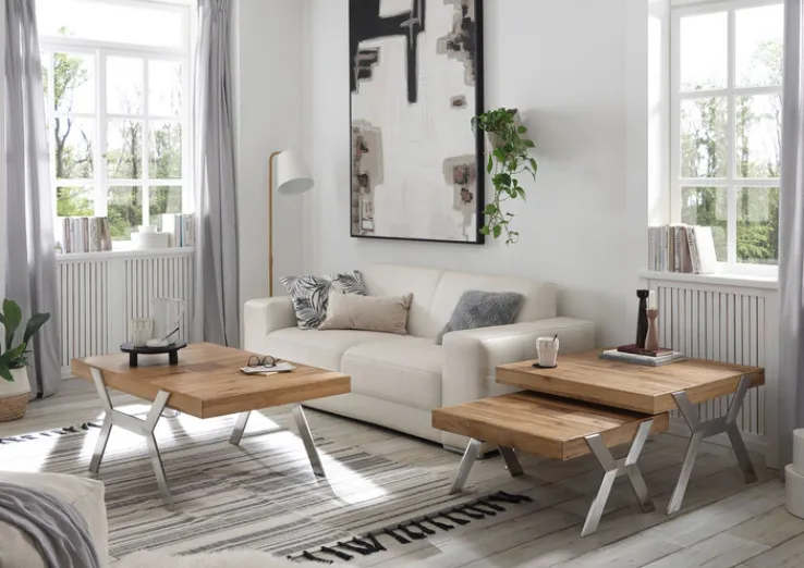 Der quadratische CASAVANTI Couchtisch BURGAS kombiniert ein silberfarbiges X-Gestell aus gebürstetem Metall und einer Tischplatte aus Zerreiche mit Hirnapplikation. Dank der geölten Oberfläche kommt die natürliche Maserung des Massivholzes perfekt zur Geltung. Gleichzeitig wird die Strapazierfähigkeit des Holzes erhöht. Der Sofatisch passt mit einer Höhe von 35 cm perfekt zur Couchhöhe und lässt sich mit einem Gewicht von maximal 30 kg belasten. Zudem bietet die quadratische Tischplatte ausreichend Platz für Getränke, Snacks, Lesestoff und vieles mehr.