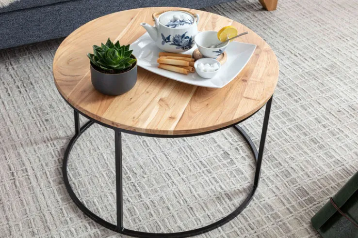 Der CASAVANTI Couchtisch mit runder Tischplatte eignet sich zum Beispiel als praktische Ablage für Tee, Kaffee und Gebäck. Zudem bringt das Gestell aus robustem Metall eine hohe Standsicherheit mit sich. Weitere Merkmale wie die Pulverbeschichtung unterstreichen den hohen Qualitätsstandard. Die Platte ist aus massivem Akazienholz gefertigt und macht den Tisch zu einem ästhetischen Blickfang. Darüber hinaus ist die Tischplatte problemlos abwaschbar, was eine unkomplizierte Reinigung und Pflege ermöglicht.