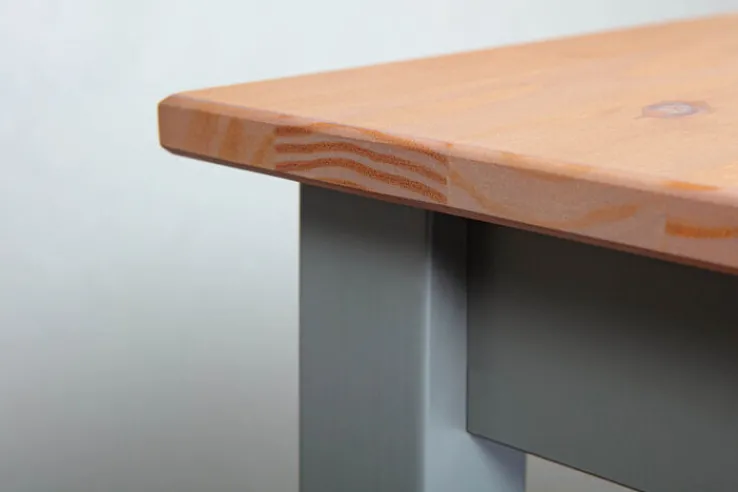 Der große Tisch mit den grauen Beinen und der braunen Platte hat ein klassisches Vierfußgestell, sodass das Modell auf jedem Boden stabil steht. Alle Bestandteile des Esstisches sind aus echtem Kiefernholz gearbeitet. Da die Oberflächen des Tisches alle mit einem Klarlack bearbeitet sind, lässt sich das Modell rasch von Schmutz befreien. Der Tisch wiegt insgesamt 19,2 Kilogramm.
