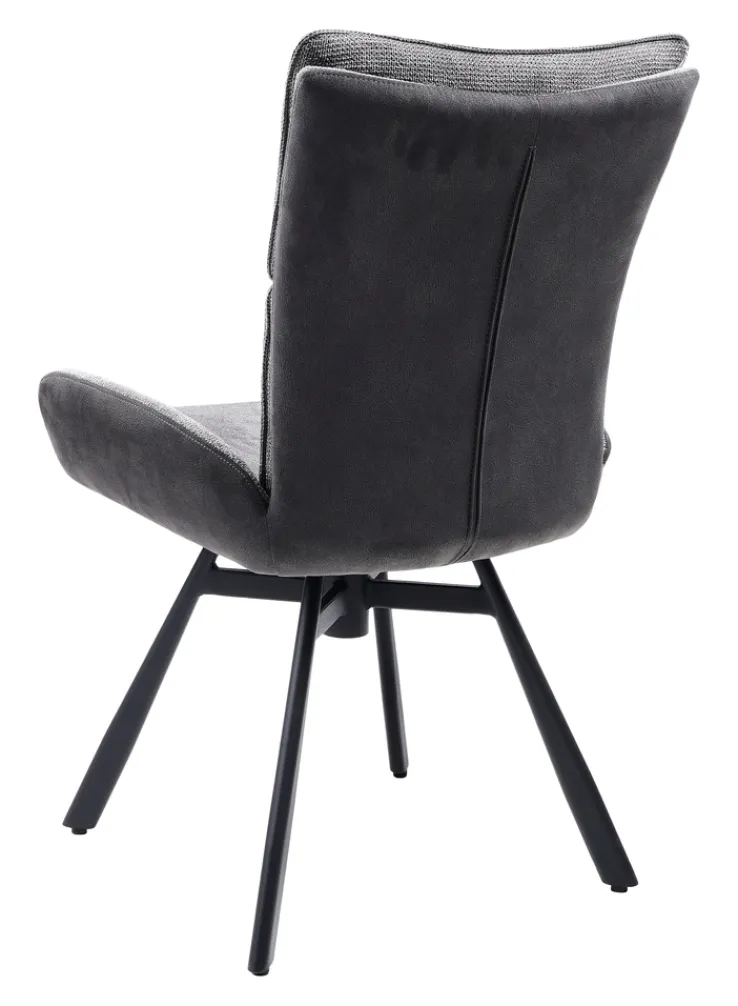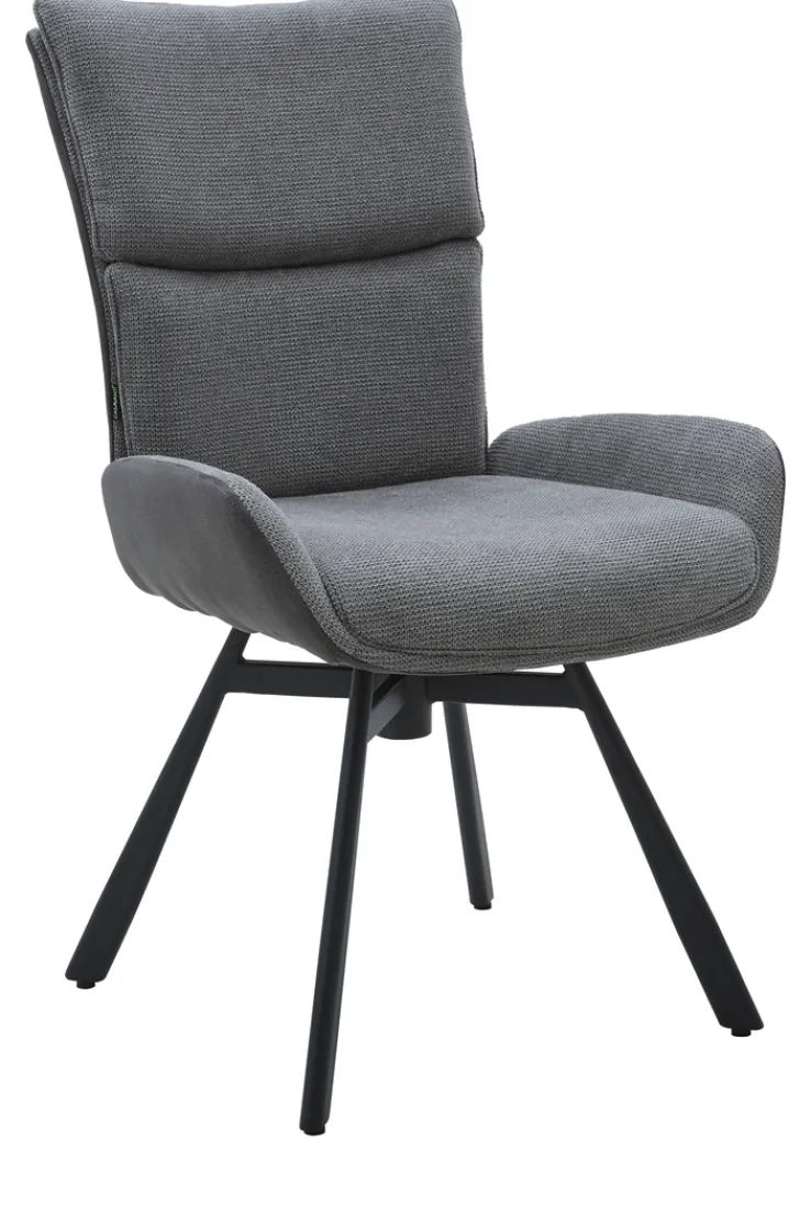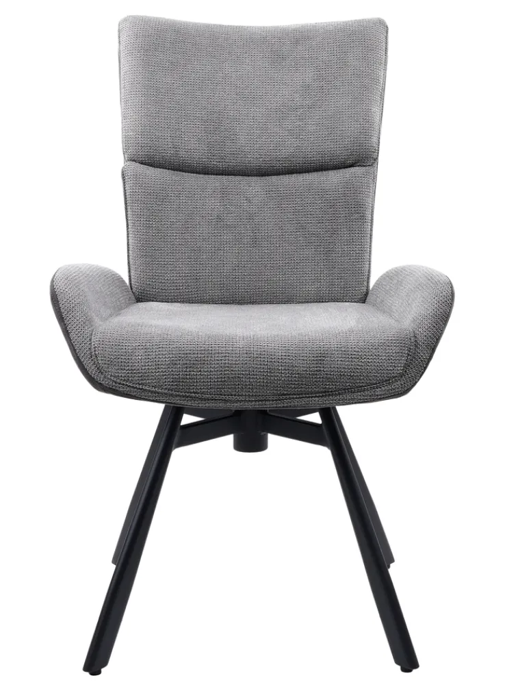 Der Esszimmerstuhl aus der Serie VARREL präsentiert sich in einem modernen Design mit klaren Linien und einem Vierfußgestell. Die Sitzschale und Rückenlehne sind mit einem grauen, strukturierten Textilbezug versehen, der eine dezente und unaufdringliche Optik bietet. Die Oberfläche des Gestells ist pulverbeschichtet und sorgt für eine widerstandsfähige und pflegeleichte Ausführung. Das Gestell aus Metall in Schwarz bildet einen stabilen Kontrast zum grauen Bezug und unterstreicht die moderne Gestaltung des Stuhls. Die großzügig gepolsterte Sitzfläche und die leicht nach außen geschwungenen Armlehnen bieten Komfort beim Sitzen. Die Drehfunktion um 360° ermöglicht Flexibilität im Esszimmeralltag und erleichtert das Hinsetzen und Aufstehen. Mit einer Breite von 64 cm, einer Tiefe von 57 cm und einer Höhe von 93 cm ist der Stuhl auf ergonomische Aspekte ausgelegt. Das Gesamtgewicht beträgt 9,75 kg. Geeignet ist der Esszimmerstuhl für den Einsatz im Esszimmer und fügt sich dank seiner neutralen Farbgestaltung in verschiedene Wohnkonzepte ein.