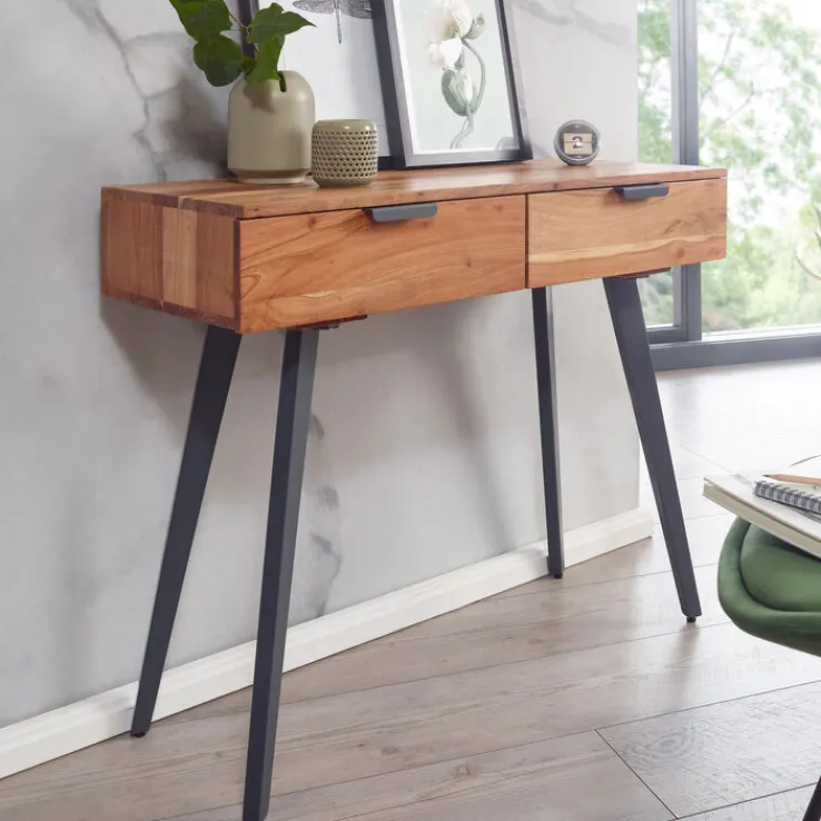 Der praktische schmale Tisch im beliebten Landhaus-Stil bietet Ablage- und Arbeitsfläche sowie relativ viel Stauraum in den Schubkästen. Die vier in der Farbe Schwarz lackierten Tischbeine, die schräg nach außen verlaufen, geben dem Modell eine 50er Jahre Optik. Alle Teile aus Akazienholz sind massiv gearbeitet, sodass das nur 20 Kilogramm leichte Modell mit bis zu 50 Kilogramm belastbar ist.