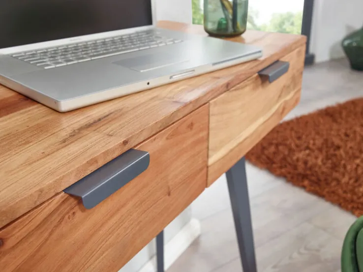 Der rustikal designte Konsolentisch passt mit den Maßen 90 Zentimeter Breite, 36 Zentimeter Tiefe und 78 Zentimeter Höhe an jede Wand im Haus. Das Modell überzeugt in hellen Braun- und Grautönen. Das Akazienholz der Tischplatte und der beiden Schubladen ist abwaschbar gestaltet.
