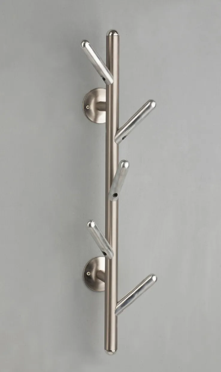 Die Wandgarderobe besitzt zwei runde Befestigungen für die Wand. Daran ist eine lange Stange mit insgesamt fünf Haken befestigt. Sie besteht komplett aus Metall, sodass sie sehr belastbar und noch dazu temperaturbeständig sowie rostfrei ist. Die Oberfläche ist gebürstet und bietet so eine sehr edle Optik.