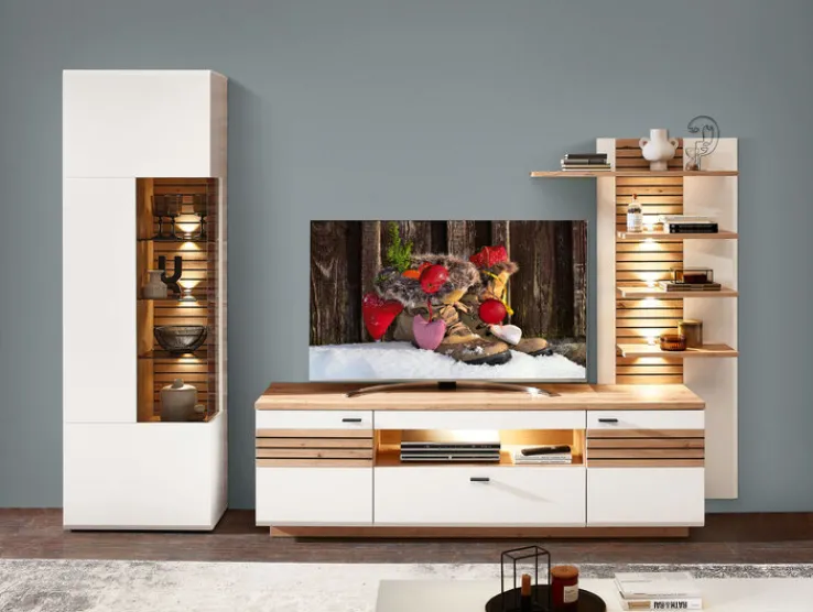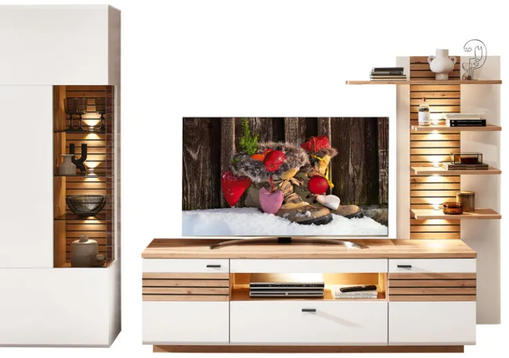 Die CASAVANTI Wohnwand FRESNO besteht aus einer Vitrine, einem TV-Lowboard und einem Wandpaneel. Sie benötigt eine Stellfläche von mindestens 296 x 201 x 47 cm und schenkt dem Wohnzimmer ein stylisches Ambiente. Zu verdanken ist die moderne Optik einer Kombination aus mattem Weiß mit Artisaneiche und extravaganter Leistenoptik. Schublade und Drehtüren sind mit Selbsteinzug und Soft-Close ausgestattet, wodurch die Möbelstücke besonders leise geschlossen werden können. Das Entspannen im Wohnzimmer fällt somit noch leichter.