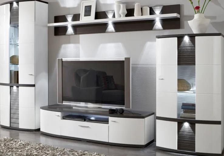 Die elegant und modern designte Wohnwand CABANA der Marke CASAVANTI bereichert das Ambiente mit attraktiver Farbgebung. Sie ist in zeitlosem Weiß Hochglanz gestaltet und mit grauen Absetzungen im Farbton Grafit versehen. Eine integrierte Beleuchtung mit LEDs der EEZ Klassen A – A++ taucht jede Komponente in angenehmes Licht.