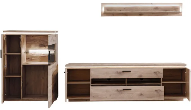Setartikel: jaAnzahl Teile im Set: 3 Stk.Breite Setartikel 1: 90 cmHöhe Setartikel 1: 124 cmTiefe Setartikel 1: 38 cmSetartikel-Inhalt 1: HighboardAnzahl Setartikel-Inhalt 1: 1 Länge Setartikel 2: 210 cmTiefe Setartikel 2: 50 cmHöhe Setartikel 2: 65 cmSetartikel-Inhalt 2: TV-LowboardTiefe Setartikel 3: 19 cmBreite Setartikel 3: 150 cmHöhe Setartikel 3: 24 cmSetartikel-Inhalt 3: WandboardAnzahl Schubkästen inklusive: 2Anzahl Beleuchtungen inklusive: 2Anzahl Drehtüren inklusive: 4