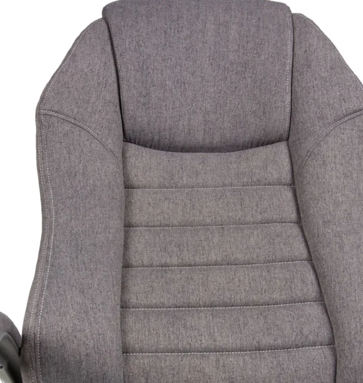 Sitz und Rückenlehne sind aufwendig gearbeitet und formen ergonomische Flächen, die den Rücken und Kopf gut stützen. Der graue Textilbezug hat eine feine Struktur, fühlt sich gut an und ist pflegeleicht. Farblich passend sind die Armlehnen aus gebürstetem Metall und Stoff. Der höhenverstellbare Chefsessel DIRK lässt sich zwischen 49 und 57 cm einstellen. Die maximale Gesamthöhe beträgt 124 cm. Die Kippmechanik lässt sich individuell einstellen oder schwingt frei. Und der Sternfuß mit den leicht laufenden Kunststoffrollen, das mit schwarzen Elementen abgesetzt ist.