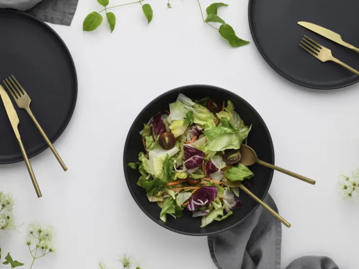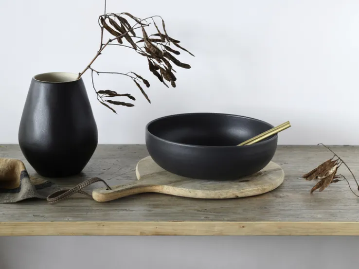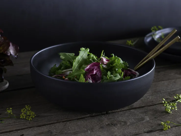 Die runde Salatschüssel aus der Serie UNO SCHWARZ überzeugt durch ihr reduziertes, modernes Design und eine gleichmäßig matte, schwarze Oberfläche. Gefertigt aus robustem Steinzeug, ist die Schüssel glasiert und besitzt eine angenehme Haptik. Mit einem Durchmesser von 28 cm, einer Höhe von 3 cm und einem Gewicht von 0,9 kg eignet sich dieses Modell ideal für den täglichen Einsatz in der Küche.