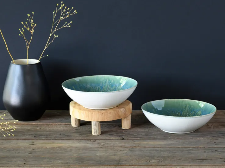 Die CreaTable Salatschüssel YUKI verdankt ihre außergewöhnliche Optik der Reaktivglasur. Diese verläuft während des Brennvorgangs und macht aus jeder Schüssel ein Unikat. Die gesamte YUKI-Serie hat sich mit ihrem aufsehenerregenden Look den German Design Award 2023 verdient. Natürlich sieht die Salatschüssel nicht nur gut aus! Sie ist mikrowellengeeignet sowie spülmaschinenfest. Somit ist sie extravagante Schüssel nicht nur für festliche Anlässe, sondern auch im Alltag eine gute Wahl.