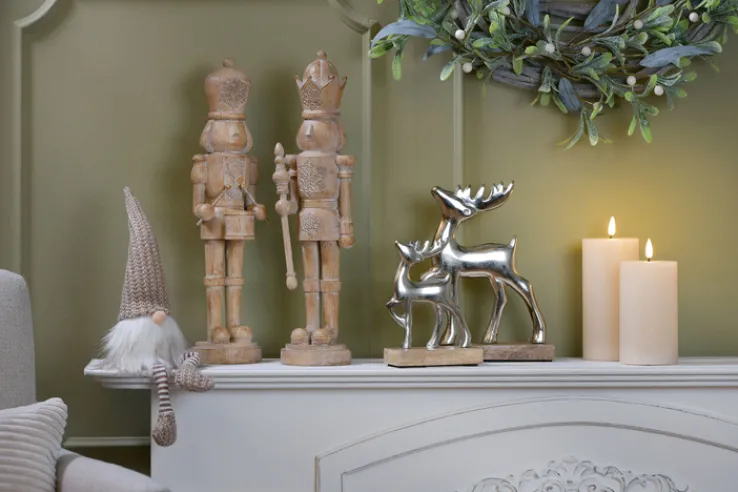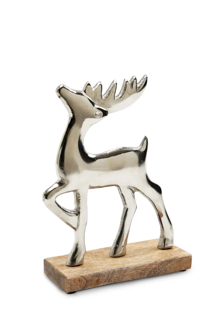 Die Dekofigur aus der Serie BLACK FORREST stellt einen stilisierten Hirsch dar. Das Objekt kombiniert einen silberfarbenen Aluminiumkörper mit einer rechteckigen Basis aus Mangoholz. Die Oberfläche des Metalls ist glatt und glänzend, wodurch die Konturen und das Geweih des Hirsches klar hervortreten. Die Holzbasis zeigt eine natürliche Maserung und bildet einen harmonischen Kontrast zur Metallfigur. Mit einer Höhe von 20 cm eignet sich die Figur für den Innenbereich und kann vielseitig im Wohnraum platziert werden. Das Zusammenspiel von braunem Holz und silberfarbenem Metall unterstreicht den modernen, dekorativen Charakter.