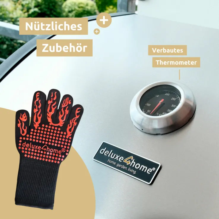 Der edle deluxe4home Gasgrill GRILLWAGEN XXL macht nicht nur optisch viel her, er überzeugt auch durch seine Ausstattung. Neben einer großen Grillfläche verfügt er über einen zweiten Rost, auf dem empfindliche Speisen punktgenau garen oder fertiges Grillgut die ideale Temperatur behält. In der geschlossenen Variante gelingen große Braten ebenso wie Brot und Pizza, die eine willkommene Abwechslung beim Grillabend sind. Grillthermometer und Handschuhe gehören zum Lieferumfang. Bitte Hinweise am Artikel beachten!