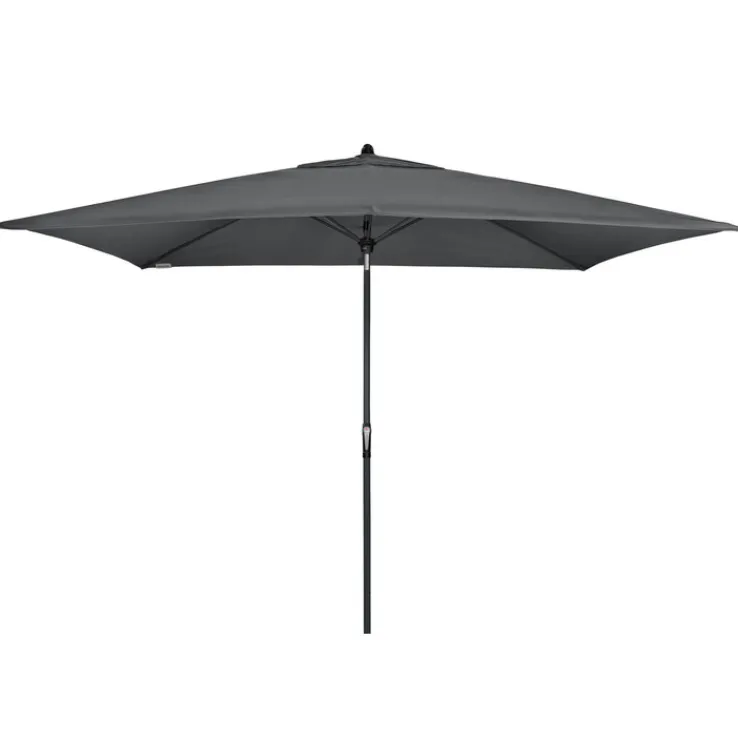 Der doppler Sonnenschirm SPIRIT BLACK hat eine Größe von 300 x 200 cm und passt dank seines schlichten, anthrazitfarbigen Designs in jeden Garten.