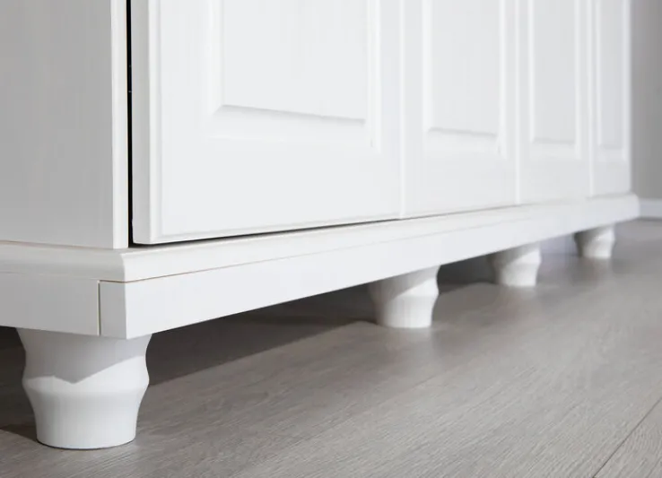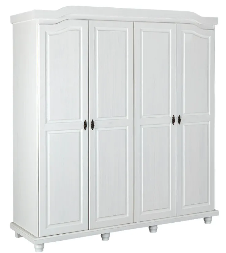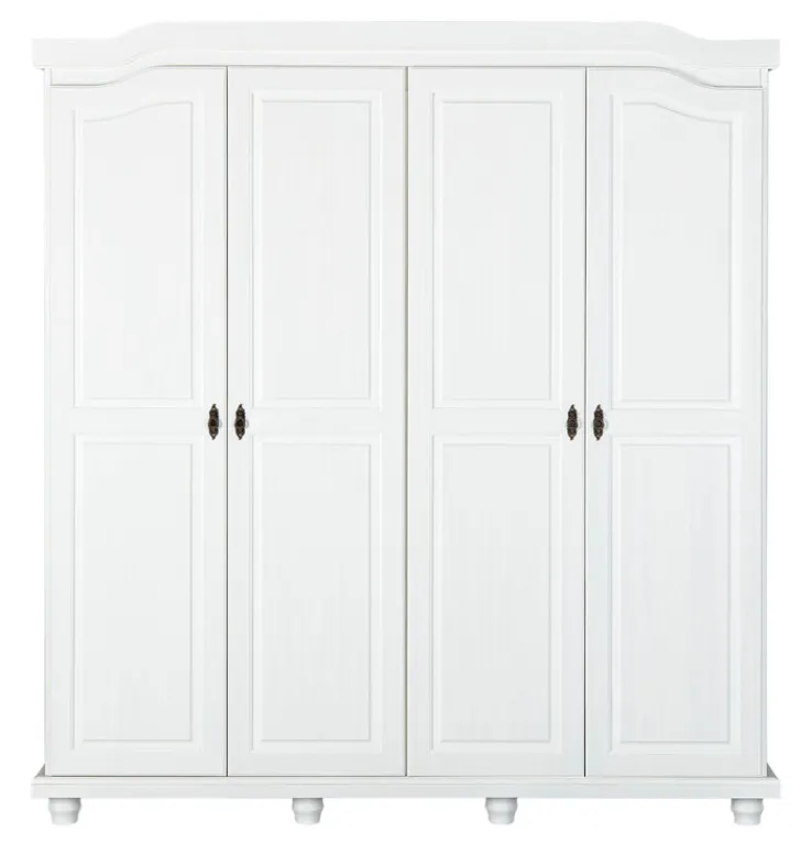 Der Drehtürenschrank FYNN ist im Landhausstil gehalten und überzeugt durch Eleganz sowie hohe Qualität. Der Stauraum hinter den vier stabilen Drehtüren bietet links und rechts, oben und unten je zwei Einlegeböden aus Holz. Im oberen Bereich befindet sich links und rechts je eine stabile, chromfarbige Kleiderstange aus Metall. Der Schrank mit attraktiven, schwarzen Metall-Klappgriffen steht auf acht Füßen aus Holz, die eine interessante Form aufweisen.
