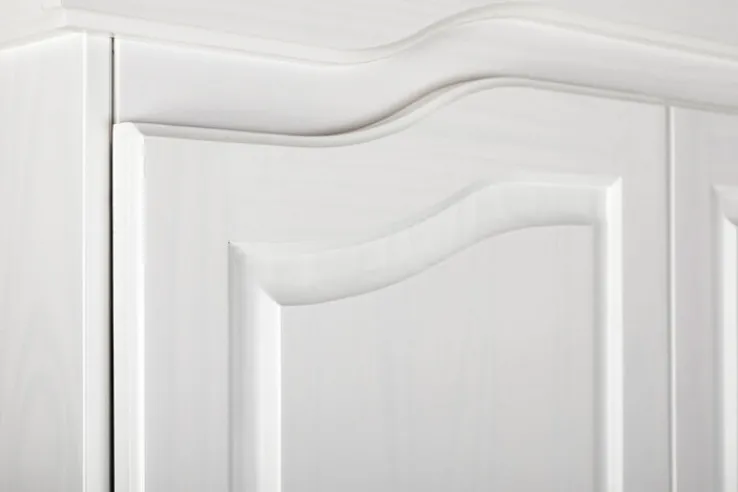 Der Drehtürenschrank FYNN ist 182 cm breit, 197,5 cm hoch und aus echtem, massivem Kieferholz gefertigt. Die Beschichtung der Front- Oberfläche ist eine weiße Lackierung, durch diese ist die dezente Echtholz Maserung noch sichtbar.