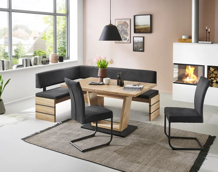 Wer auf der Suche nach Möbeln für ein Gartenhaus ist, trifft mit der Eckbank ebenfalls eine hervoragende Wahl. Der lange Schenkel der Eckbank befindet sich auf der rechten Seite. Auf einem Wangengestell sind die Sitzfläche und Rückenlehne fixiert. Dieses ist mit einer Struktureiche-Optik versehen und ausgesprochen modern.