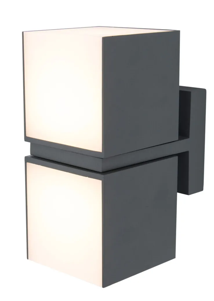 Die Wandlampe ist 2-flammig und unterteilt sich in zwei Würfel, die übereinander angeordnet sind. Dadurch entsteht ein klares und minimalistisches Design. Das Gehäuse besteht aus Aluminium und ist somit sehr robust, sodass sie es problemlos im Außenbereich einsetzen können. Die Lichtleistung der integrierten Leuchtmittel liegt bei 1000 lm, während die Lichtfarbe 3000 K hat, sodass das Licht ausreichend hell und zugleich sehr angenehm ist. Gerne können Sie die Lampe nutzen, um Ihren Eingangsbereich zu beleuchten. Doch auch auf der Terrasse oder auf Ihrem Balkon leistet sie gute Dienste.