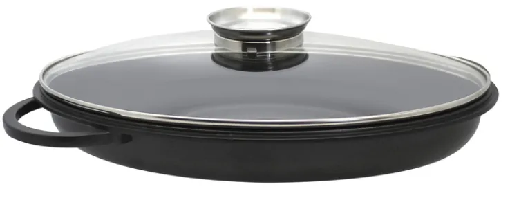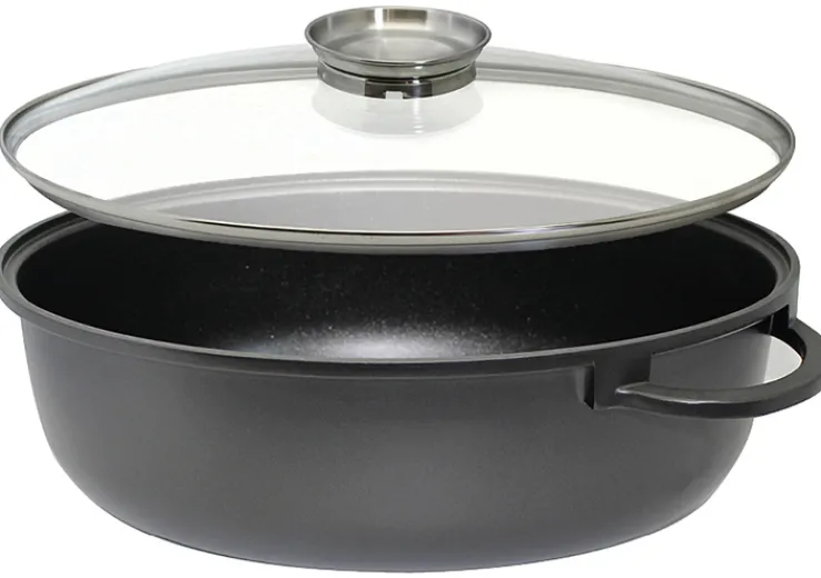 Der 3-teilige ELO Bräter ALUCAST ist 29 cm breit, 41,5 cm lang und 17,8 cm hoch. Sein Durchmesser beträgt 38 cm, das Gewicht 4,3 kg. Er ist aus schwarzem Aluminiumguss mit einem Glasdeckel.
