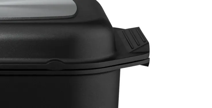 Der schwarze Rechteckbräter KARREE von ELO mit dem silberfarbigen Einsatz im Deckel und den praktischen Griffen an der Seite bietet mit den Maßen 42 Zentimeter Breite, 25 Zentimeter Tiefe und 15 Zentimeter Höhe viel Platz für Braten, Enten, Gänse und Hühner.