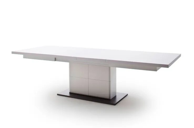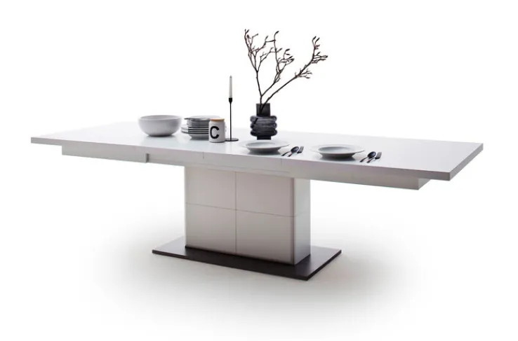 Der Esstisch besitzt eine rechteckige Bodenplatte in Grau. Darauf befindet sich eine breite Säule. Auf dieser ruht die rechteckige Tischplatte, die aus einer hochwertigen Holznachbildung besteht. Der Tisch ist mit einem Auszug ausgestattet und lässt sich so bei Bedarf erweitern. Das geradlinige Design wirkt sehr modern und minimalistisch und fügt sich aufgrund seiner Einfachheit in zahlreiche Einrichtungen. Nicht nur in puristischen Wohnkonzepten, auch in eleganten Einrichtungen kommt der Esstisch gut zur Geltung. Trotz seiner Größe bietet er sich außerdem auch für kleine Räume an. Denn dank der weißen Farbe wirkt er nicht wuchtig.