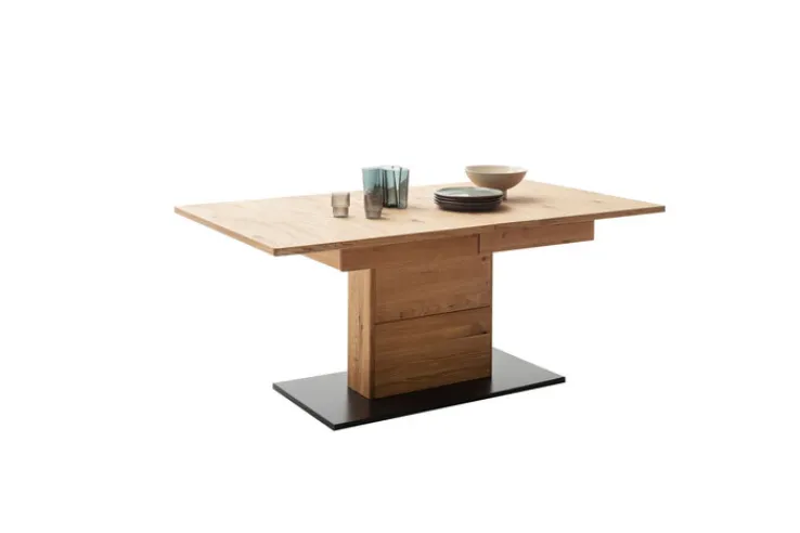 AREZZO verfügt über einen einfach zu bedienenden und sehr robusten Synchronauszug. Der trendstarke und anspruchsvoll verarbeitete Esstisch wurde aufwendig furniert und geölt und hat eine Höhe von 77 cm. Optisches Highlight ist die Bodenplatte in Anthrazit Dunkel, die zu dem warmen Holzton einen interessanten Kontrast bildet. Das Säulengestell trägt auch in einer größeren Runde zu einer optimalen Beinfreiheit bei.