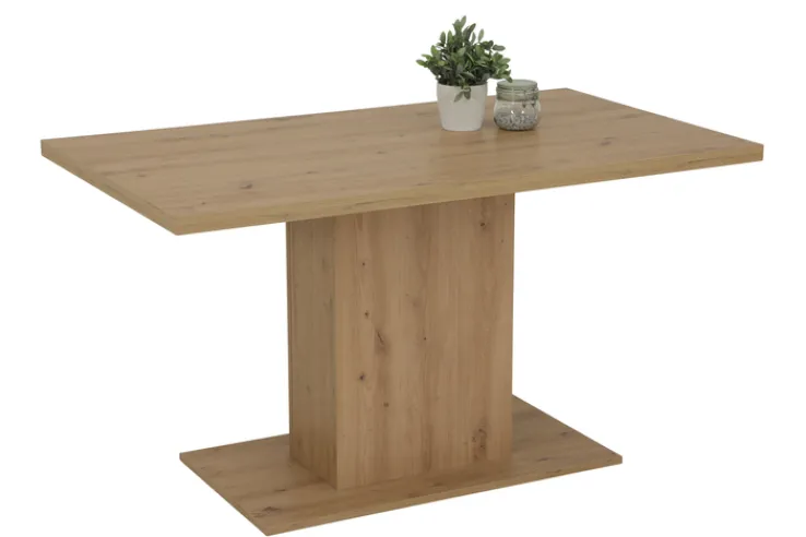 Der braune Esstisch LINN 138 x 80 x 76 cm besteht aus robuster Holznachbildung und gefällt mit seinem schönen Artisan-Eiche-Dekor. Ein optisches Highlight ist das Säulengestell, das dem Tisch zugleich Stabilität verleiht.