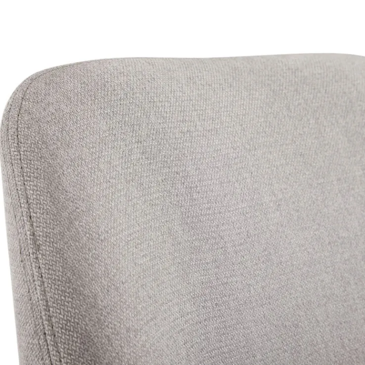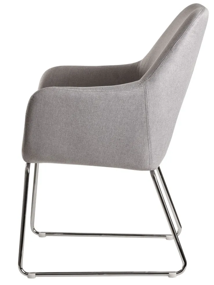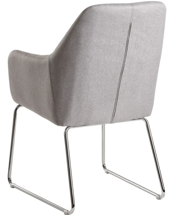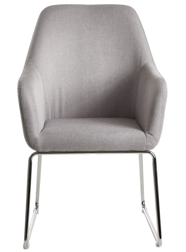 Der Hersteller platziert die Sitzschale des mit hellgrauem Stoff bezogenen, gepolsterten Stuhls auf einem Kufengestell aus silberfarbigem Stahl. Der Esszimmerstuhl ist mit angenehmen Armlehnen versehen und bis 110 Kilogramm belastbar.