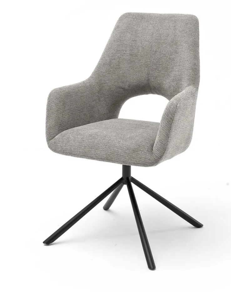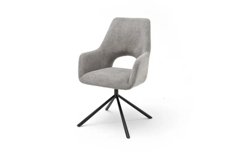 Der abgebildete Armlehnstuhl vereint modernes Design mit funktionaler Eleganz. Der Stuhl ist in einem ansprechenden Grauton gehalten, der sich harmonisch in verschiedene Wohnstile einfügt. Die Textiloberfläche bietet eine angenehme Haptik und verleiht dem Stuhl eine einladende Optik. Das Gestell aus Metall ist schwarz lackiert und sorgt für Stabilität und eine moderne, matte Optik. Die drehbare Funktion des Stuhls erhöht den Komfort und die Flexibilität im Alltag.