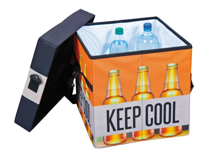 Die Faltkiste FANBOX II in den Farben Schwarz, Orange und Weiß ist eine clevere Idee, Getränke zu kühlen. Besonders praktisch: Sie lässt sich auch als Sitzhocker nutzen.
