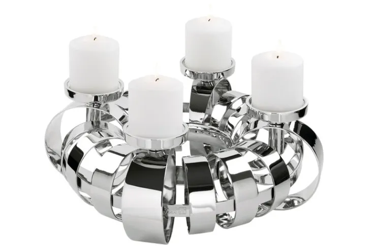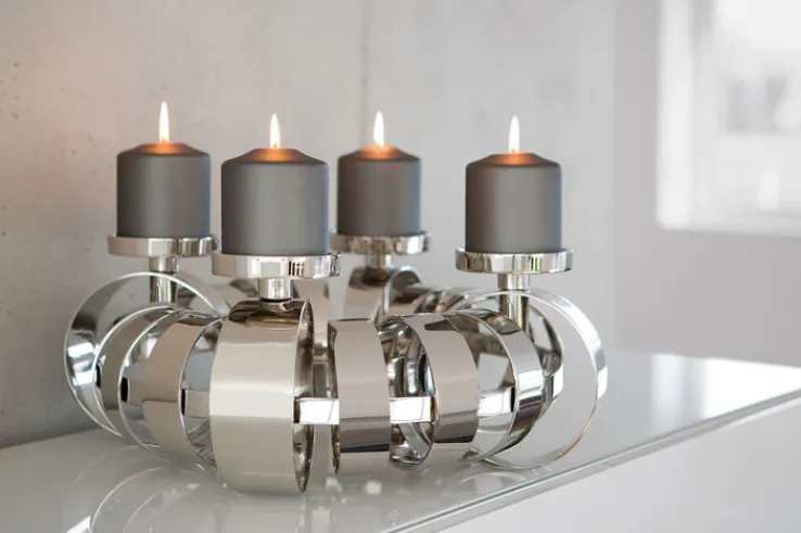 Der Adventskranz ANELLO von der Marke FINK besteht aus hochwertigem, silberfarbigem Metall und bietet eine außergewöhnliche Dekoration für die Adventszeit. Mit vier Kerzen setzt er im Wohnbereich oder in der Diele ganz besondere Akzente. Der Dekokranz ist 18,5 Zentimeter hoch und hat einen Durchmesser von 40 Zentimeter. Er setzt sich aus unterschiedlich breiten und großen Schlaufen aus vernickeltem Metall zusammen, welche aufwändig verarbeitet sind und durch glänzende Oberflächen für einen eindrucksvollen Blickfang sorgen. Das formvollendete Design des Dekokranzes ANELLO verbreitet eine stimmungsvolle Atmosphäre und bereitet auf stilvolle Weise auf die Weihnachtszeit vor. Der Kranz ist ausgelegt für vier Stumpenkerzen und erstrahlt dann durch den edlen Edelstahl in schönstem Licht. Sind die Festtage vorbei, kann er durch die abschraubbaren Kerzenteller auch anderweitig genutzt werden, zum Beispiel als opulentes Windlicht. Dafür werden die Kerzenhalter durch kleine Standfüße ersetzt und die Windlichter mit einem hochwertigen Glaszylinder geschützt. In dieser Weise haben Sie das ganze Jahr hindurch Freude am eleganten Dekokranz ANELLO.