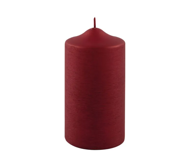 Die Fink Stumpenkerze CANDLE ist 15 cm hoch und hat einen Durchmesser von 8 cm. Ihre gebürstete Oberfläche präsentiert sich in einem satten Rotton.