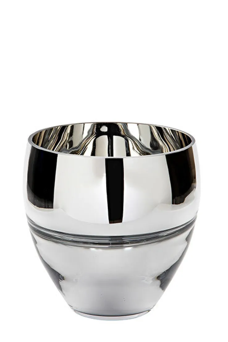 Der Teelichthalter RILA von der Marke Fink hat eine Höhe von 18 cm und ist ein silberfarbiges Modell mit einer glänzenden Optik. Er besitzt eine bauchige Form, die dem flackernden Kerzenlicht Raum zur Entfaltung bietet und dieses auf der Oberfläche stimmungsvoll bricht.