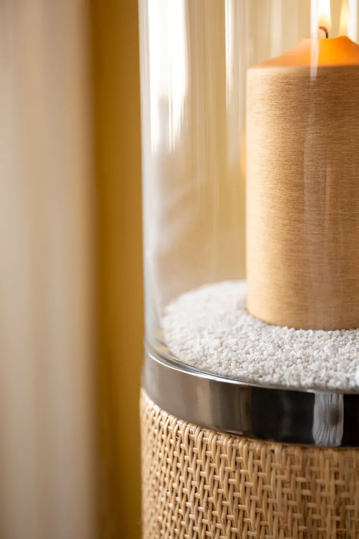 Das Fink Rattan-Windlicht CATANIA hat eine imposante Höhe von 58 cm und lässt sich als elegante Dekoration für Wohnräume sowie den überdachten Outdoorbereich verwenden.