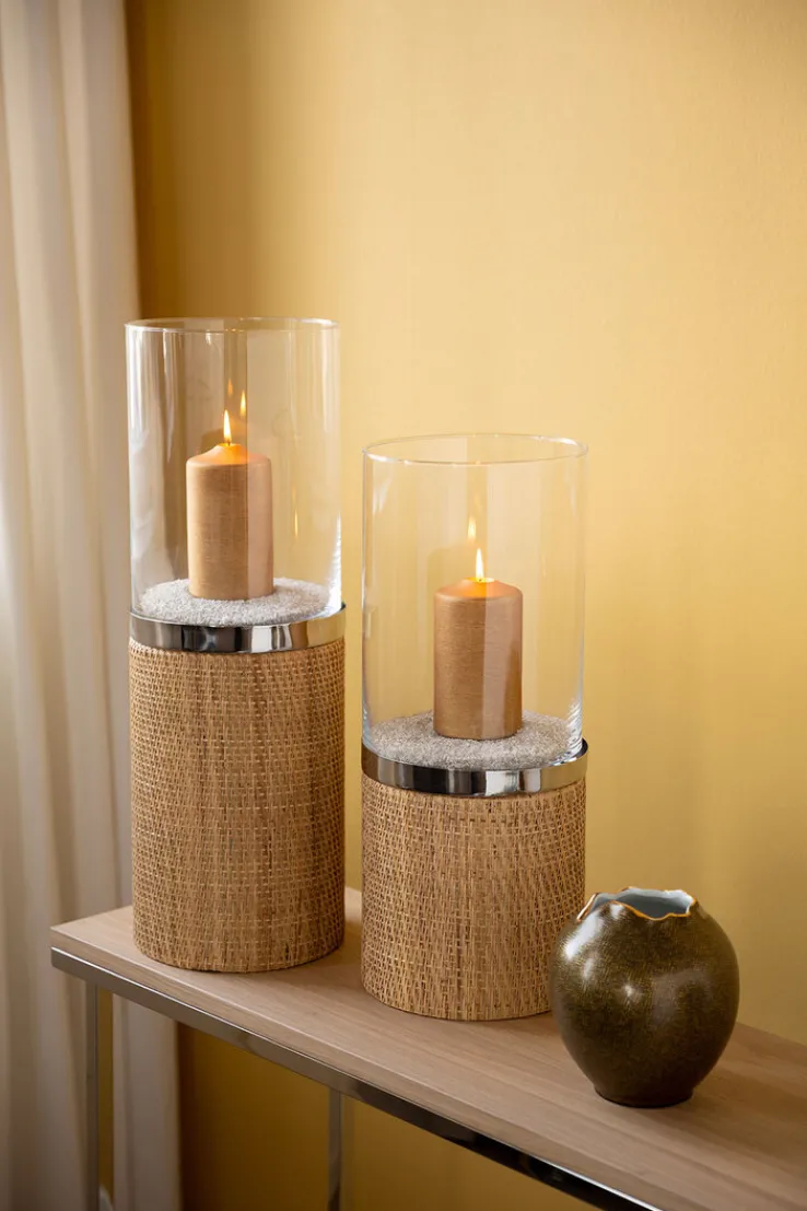 Das Fink Windlicht CATANIA besteht aus einem Rattan-Sockel mit vernickelter Stahlmanschette und einem großen Kerzenhalter aus Klarglas. Es lässt sich vielseitig als Dekoration für Tische und Sideboards verwenden und ist für jede Jahreszeit geeignet. In seinem geräumigen Glasbehälter mit 20 cm Durchmesser bietet das Windlicht nicht nur Platz für eine Stumpenkerze, auch für Dekoartikel bietet es genug Raum. Zum besonderen Eyecatcher wird das Windlicht, wenn es mit einem weiteren CATANIA Tischlicht in einer anderen Größe kombiniert wird.