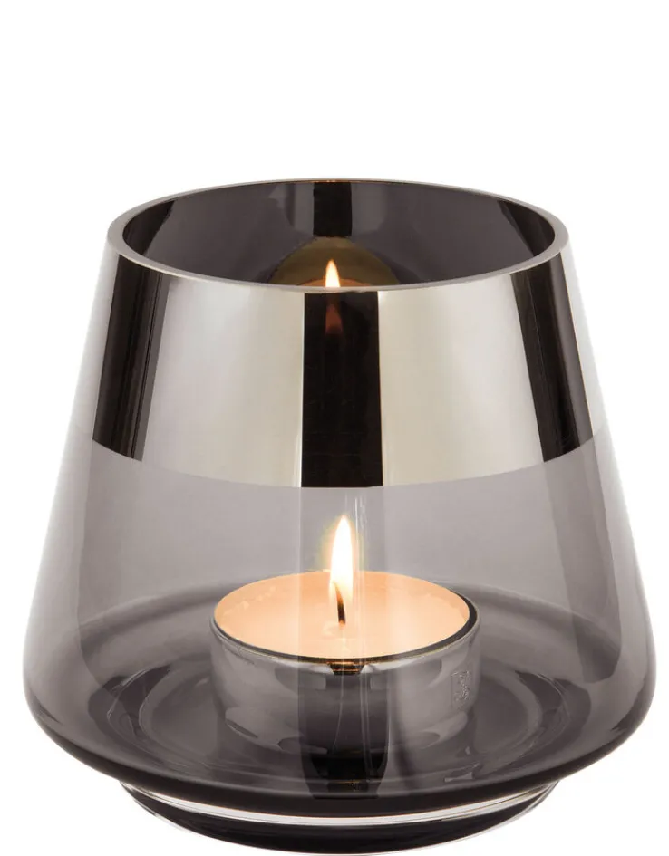 Der rauchgraue Teelichthalter JONA wird bei der nächsten Einladung mit Sicherheit für Gesprächsstoff sorgen. Ob auf der Gartenparty, beim festlichen Dinner oder einer schwungvollen Tanzparty, das vielseitige Glas passt einfach zu jedem Anlass. Dafür sorgt auch das durchdachte Design: Die schmale Öffnung an der Oberseite sorgt dafür, dass die Flamme jederzeit ruhig brennt. Die silberfarbige Umrandung reflektiert das Licht verstärkt die gemütliche Atmosphäre.