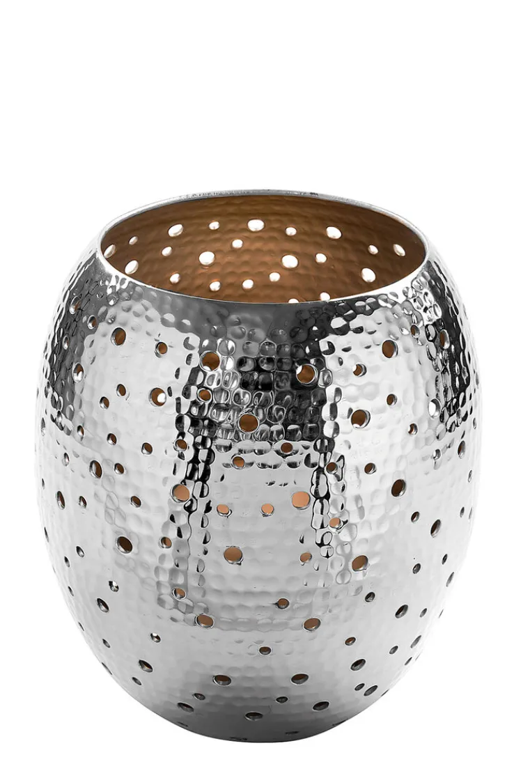 Das Windlicht mit der Bezeichnung LIAM hat eine Höhe von 11 cm, ist vernickelt und ein attraktives Wohnaccessoire aus dem Hause Fink. Es präsentiert sich mit einer faszinierenden Optik im klassischen Hammerschlag-Design und einer Lochstanzung, die für szenische Effekte sorgt. Das Kerzenlicht leuchtet durch die Lochstanzung hindurch und kann so aufregende Schattenspiele an der Wand kreieren. In dem Windlicht lässt sich entweder ein Teelicht oder eine Stumpenkerze platzieren. Sein Design ist sehr festlich, gleichzeitig aber auch zeitlos und vielseitig kombinierbar. Ob im Wohnzimmer, Flur, für die romantische Untermalung im Schlafzimmer oder für ein stilvolles Büro: Das Windlicht ist ein Allrounder.