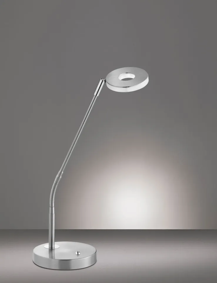Die nickelfarbige FISCHER & HONSEL CCT LED Tischlampe DENT ist mit einer Lichtfarbverstellung CCT sowie einem 3 Stufen Tastdimmer ausgestattet.