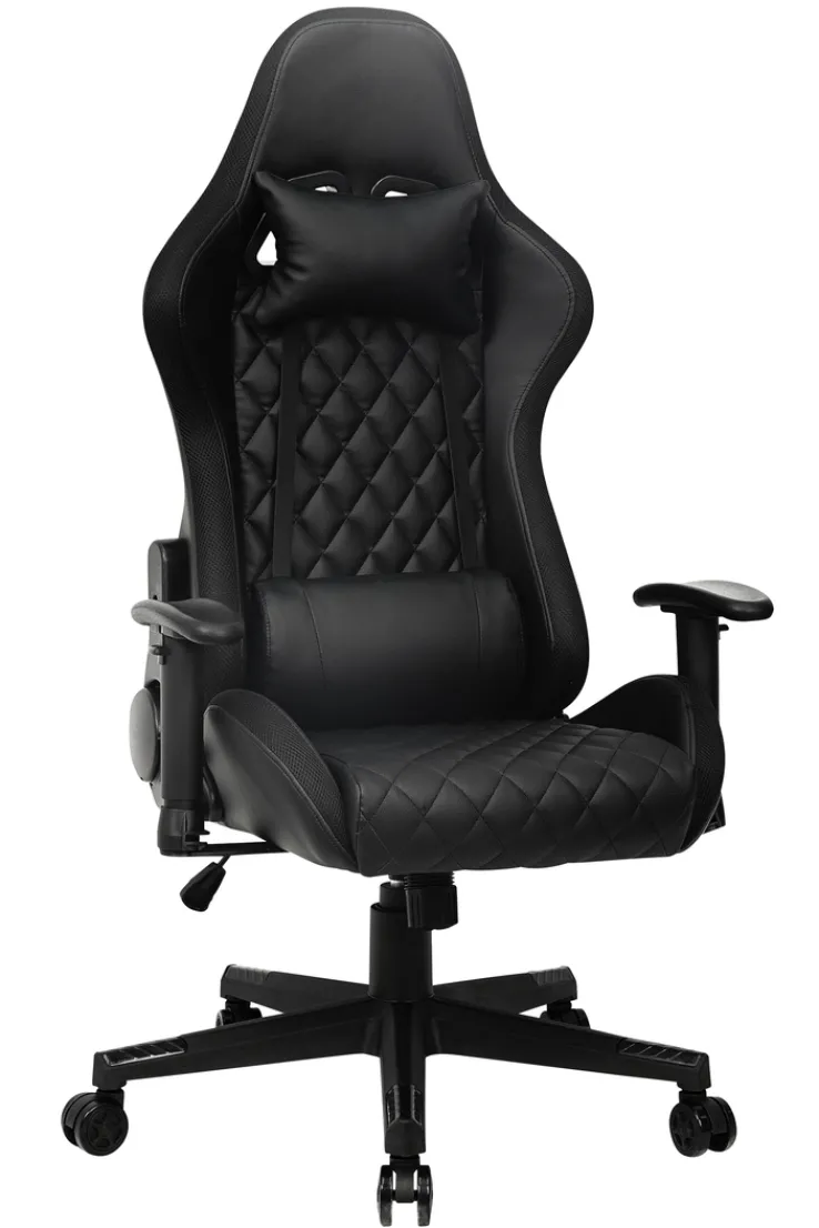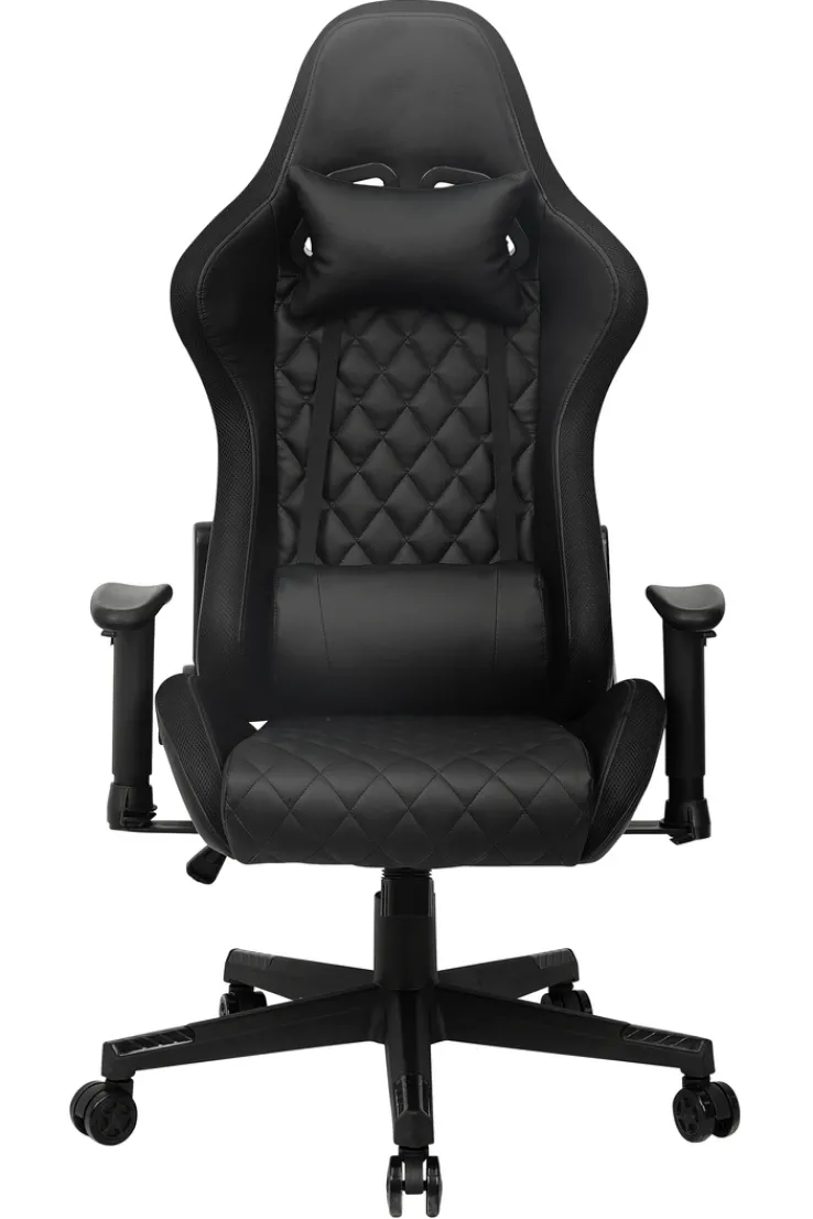 Der Gaming-Stuhl aus der Serie BIG GAMER präsentiert sich in einem modernen Design mit einer komplett schwarzen Farbgebung. Die Sitz- und Rückenflächen sind mit einer charakteristischen Rautensteppung im Kunstlederbezug aus Polyurethan (PU) versehen, was dem Stuhl eine strukturierte Optik sowie eine angenehme Haptik verleiht. Das Gestell besteht aus einem stabilen Fußkreuz mit fünf Laufrollen, die für Flexibilität und Mobilität sorgen. Die Armlehnen und weiteren Kunststoffteile ergänzen das Erscheinungsbild durch schlichte, funktionale Formen.
