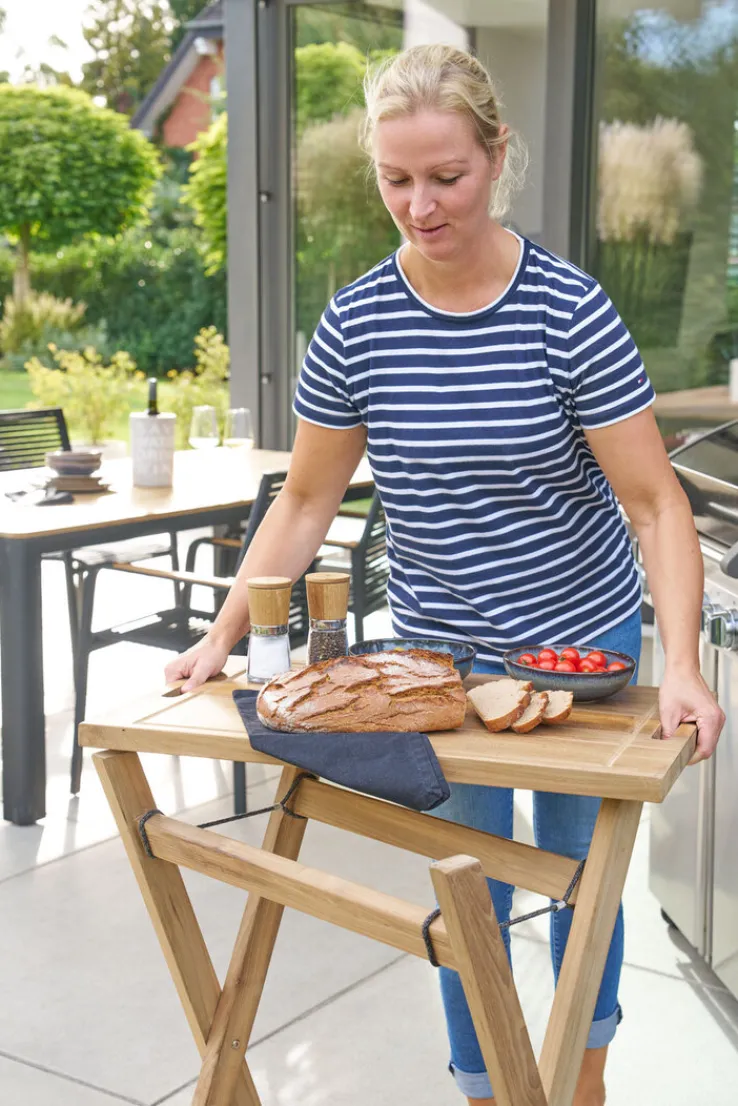 Ein richtiges Multitalent! Der Beistelltisch OTTO ist durch seine Höhe ein idealer Zubereitungstisch. Beim Grillen finden Zutaten darauf Platz, am großen Gartentisch dient er als Ablage. Auch auf dem Balkon macht er sich durch seinen geringen Platzbedarf gut. Wird er nicht mehr benötigt, ist der klappbare Tisch schnell zur Seite gestellt. Die abnehmbare Tischplatte kann als praktisches Tablett genutzt werden. Mit seiner gebürsteten Oberfläche gefällt der Tisch drinnen wie draußen gut. Bitte Hinweise am Artikel beachten!