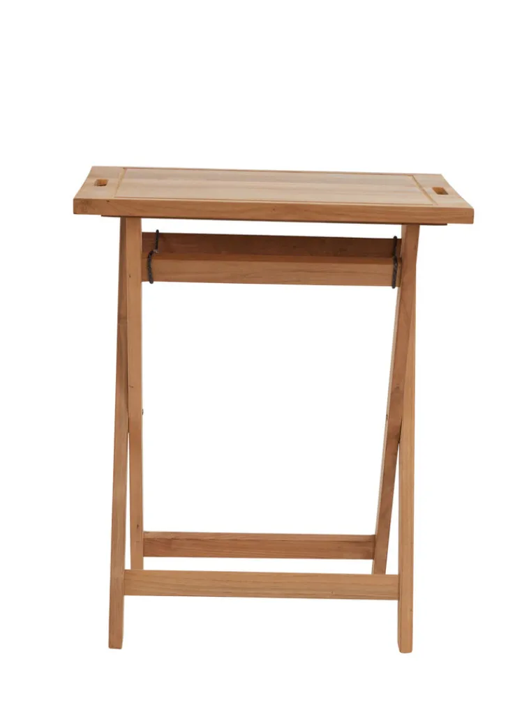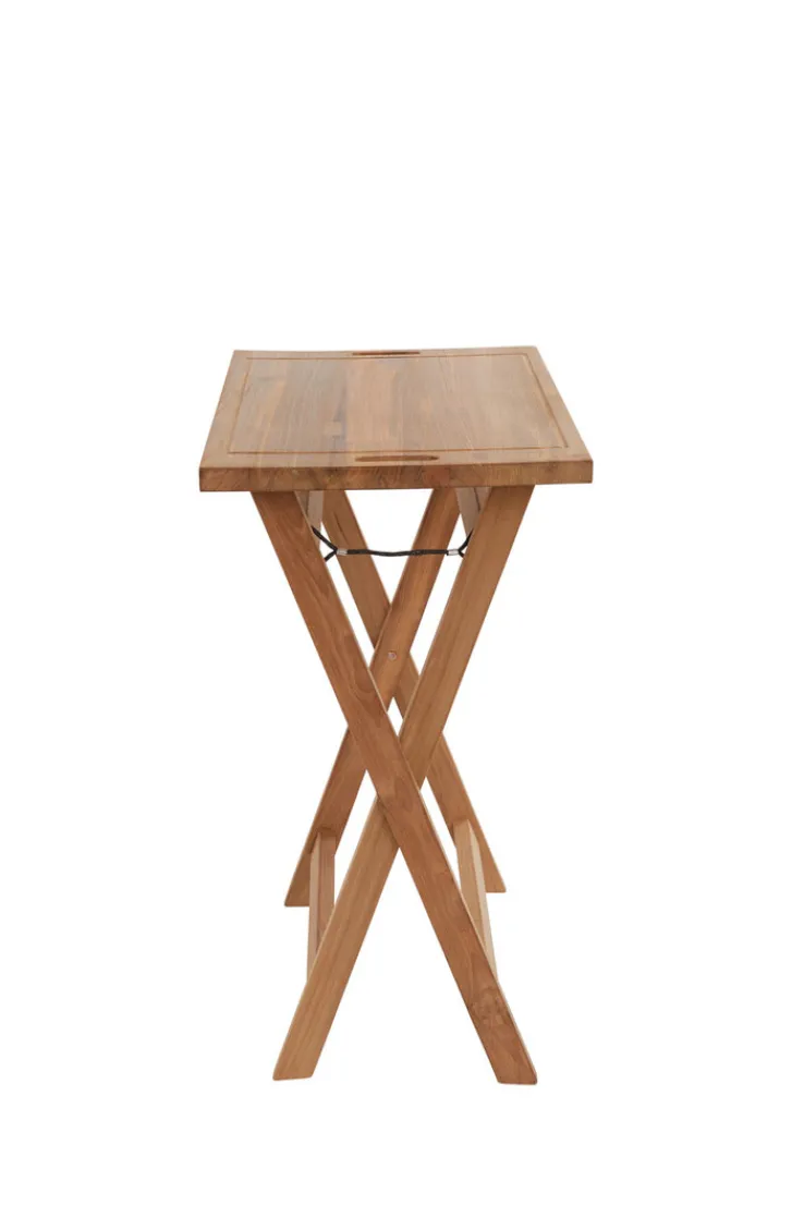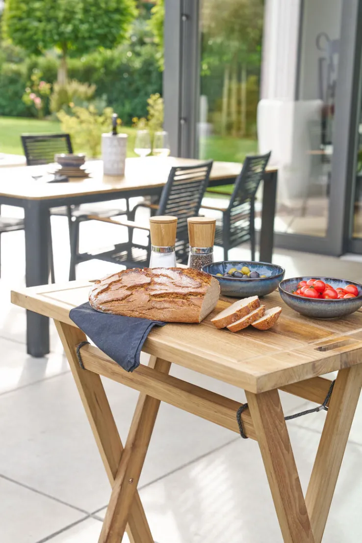Der Garden FLAIR Garten-Beistelltisch OTTO ist 70 cm lang, 45 cm breit und 87 cm hoch. Er ist aus recyceltem braunem Teakholz, klappbar und hat eine abnehmbare Tischplatte.