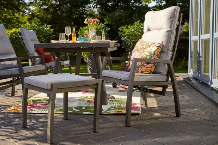Ein Knopfdruck reicht, schon bewegt sich die gemütliche Lehne von Gartenstuhl LEWIS in die gewünschte Position. Möglich macht das eine stufenlos einstellbare Gasdruckfeder. Sie ist in das Vierfußgestell aus grauem Aluminium integriert und wie der Stuhl für ein Maximalgewicht bis 110 kg ausgelegt. Gepolstert mit einer abnehmbaren Auflage in elegantem Hellgrau kann man hier entspannt speisen, Zeitung lesen oder sonnenbaden. Der bequeme Gartenstuhl ist mit weiteren Outdoor Möbeln der gleichnamigen Serie oder anderen Gartenmöbeln kombinierbar.