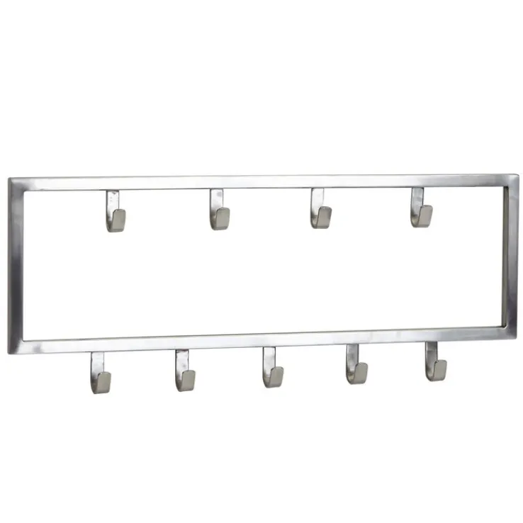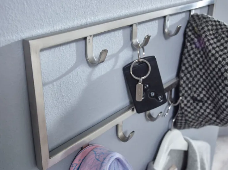 Auf der silberfarbigen Garderobenleiste mit den Maßen 50 x 20 cm lassen sich Mäntel, Jacken und Taschen aufhängen. Sie bringt insgesamt neun Haken in zwei Reihen mit und eignet sich für Singles, Paare und kleine Familien.