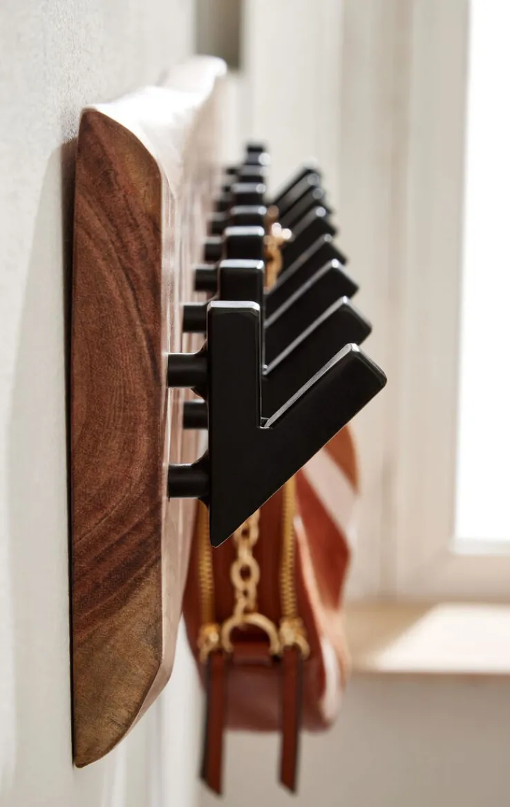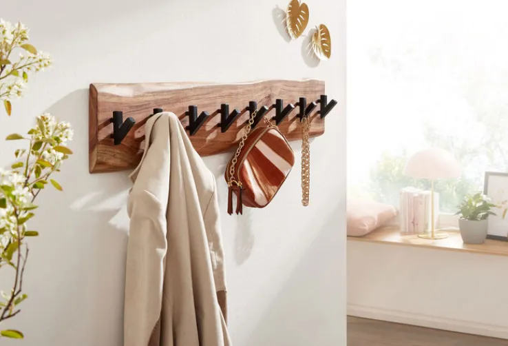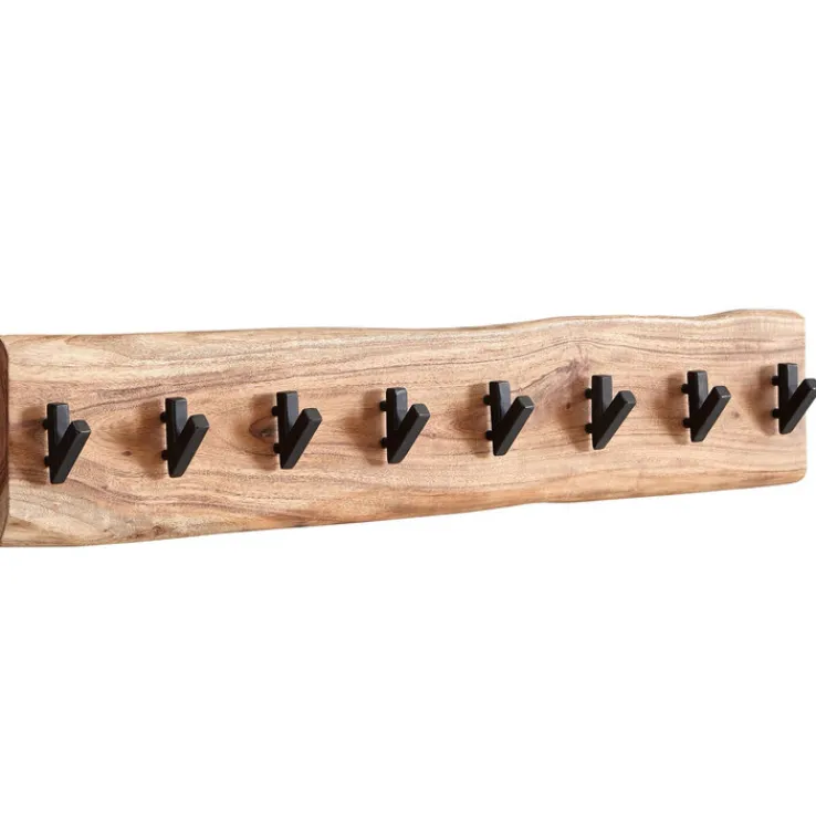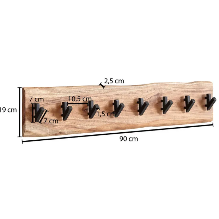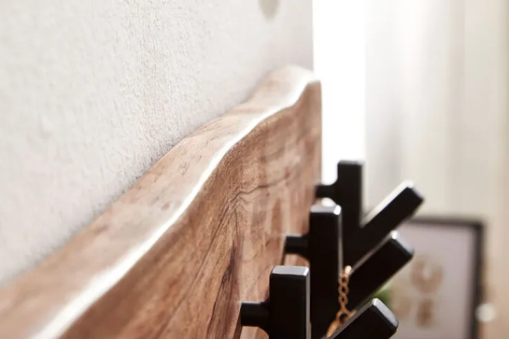 Mit insgesamt 9 Haken ist das Garderobenpaneel für die meisten Haushalte geeignet. Die Grundplatte ist aus Massivholz gefertigt. Es handelt sich um Akazie mit lackierter Oberfläche. Die Kleiderhaken sind aus Metall hergestellt. Sie sind mit einer schwarzen Lackschicht versehen. Die maximale Belastbarkeit gibt der Hersteller mit 6 kg an. Das Garderobenpaneel kommt wird teilmontiert ausgeliefert. Seine Ausladung inklusive der Haken beläuft sich auf 9 cm.