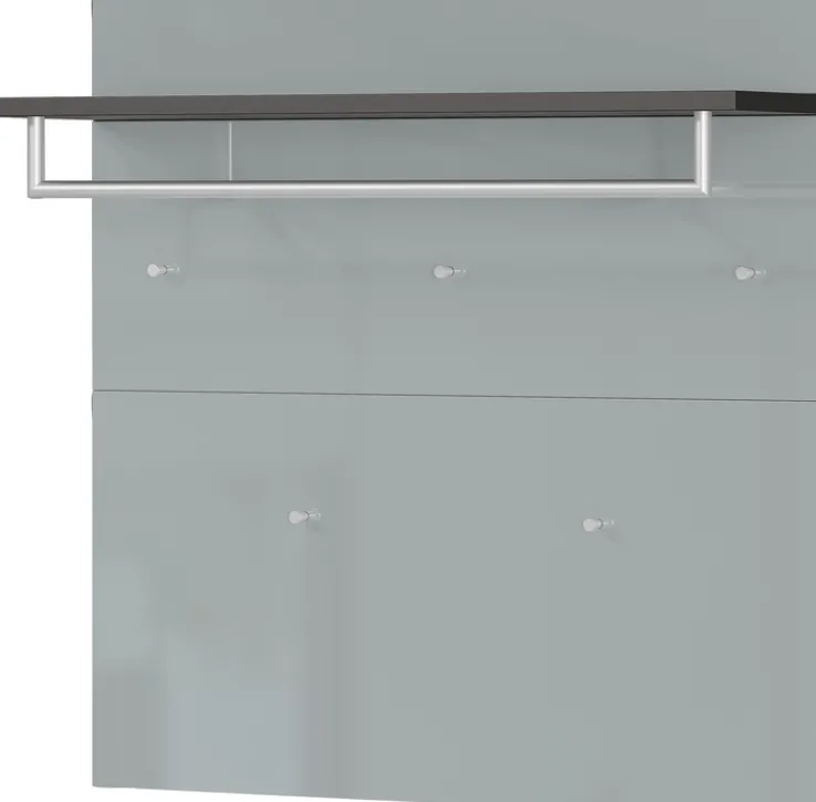 Das Garderobenpaneel LEVIN ist 97 cm breit, 96 cm hoch und 30 cm tief. Die Glasfront ist silbergrau, der Ablageboden graphit. Es verfügt über 1 Kleiderstange und 5 Haken aus chromfarbigem Metall.