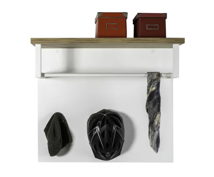 Das Garderobenpaneel MUNDI ist 83 cm breit, 35 cm tief und 71 cm hoch. Es ist aus Holznachbildung in Hochglanz mit Absetzungen in Eiche-Riviera-Dekor und verfügt über 3 Haken, 1 Kleiderstange und 1 Hutablage.