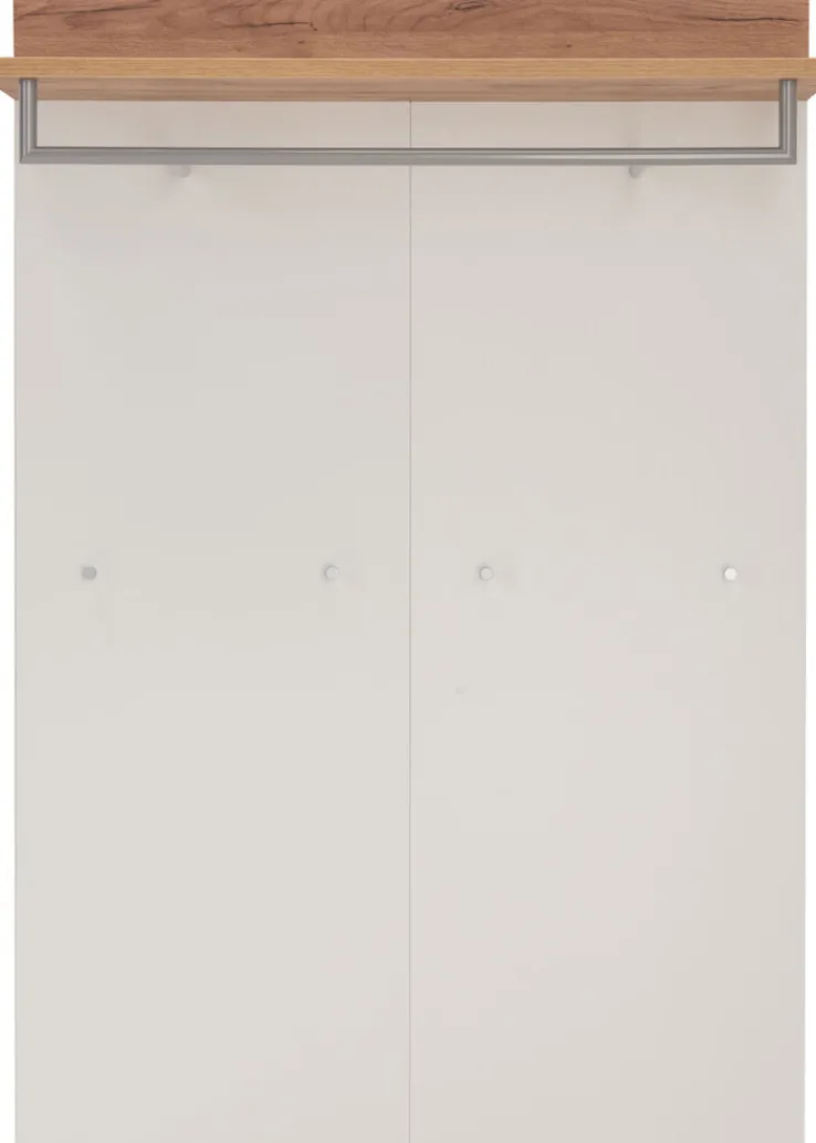 Das Garderobenpaneel präsentiert sich in gradlinigem Design in rechteckiger Formgebung und Lackierung in Weiß. Der Ablageboden im oberen Bereich ist in natürlich anmutender Navarra Eiche Nachbildung ausgeführt. Er setzt sich in hellem Braun mit charakteristischen Merkmalen in Szene. An der Unterseite des Bodens ist eine belastbare Kleiderstange aus Metall befestigt. An ihr finden Jacken und Mäntel Platz, Mützen, Hüte und Accessoires können auf dem Boden abgelegt werden. Für einen harmonischen Eingangsbereich bietet Ihnen unser Shop Interieur in identischer Farbkombination und Gestaltung an.