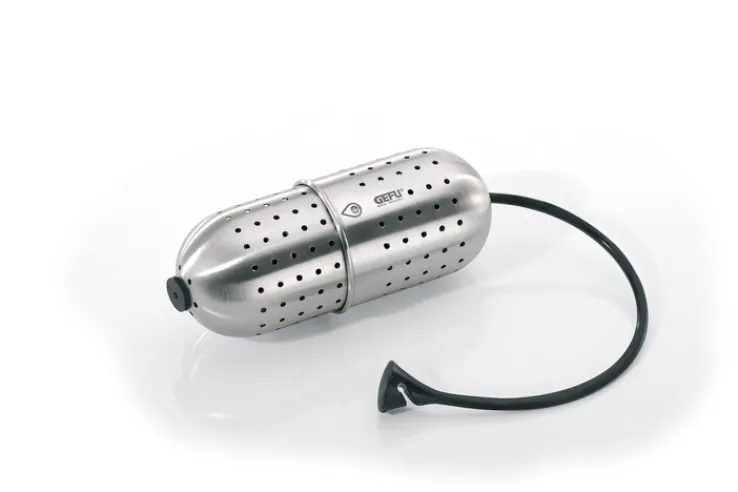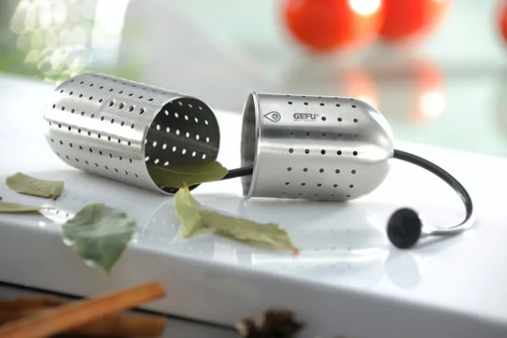 Das GEFU Gewürz-Sieb GUSTO in den Farben Schwarz und Silberfarbig eignet sich zur schonenden Verfeinerung von Suppen, Eintöpfen, Soßen und Getränken noch während der Erhitzung. Warum nicht einen Glühwein mit schmackhaften Gewürzen verfeinern? Außerdem können in das ellipsenförmige Sieb Lorbeerblätter und Kräuter eingefüllt werden. Anschließend wird es mittels der angebrachten Halterung am Henkel des Topfes befestigt. Verschiedene Volumina können mühelos in vier Stufen eingestellt werden. Durch die eingestanzten Öffnungen entweicht die Hitze während des Erhitzungsvorgangs.