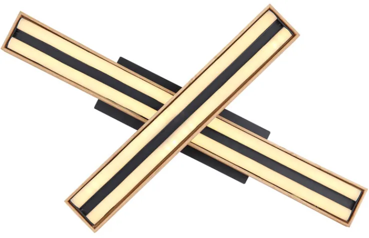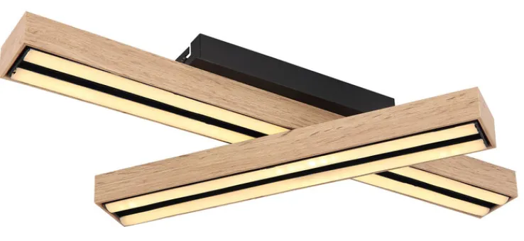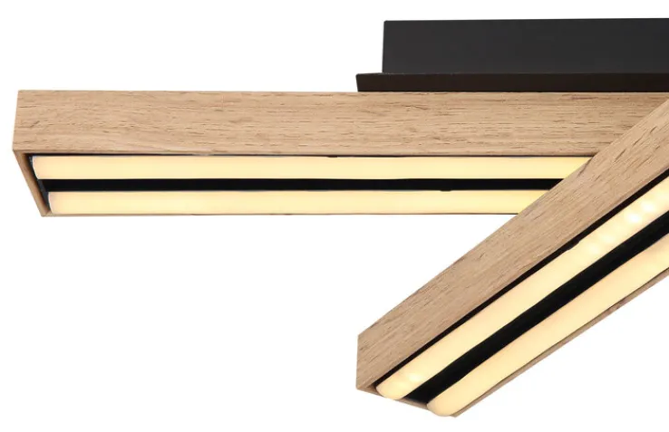 Die Balken der Deckenlampe sind aus Metall und MDF-Platte gestaltet. Die Oberflächen sind in einem Holzdekor gestaltet. Das fest eingebaute LED-Leuchtmittel der Deckenlampe befindet sich hinter einer Blende aus Acryl.