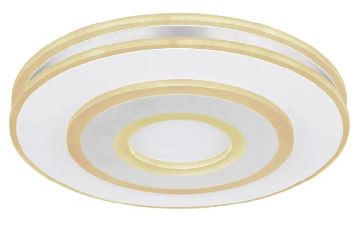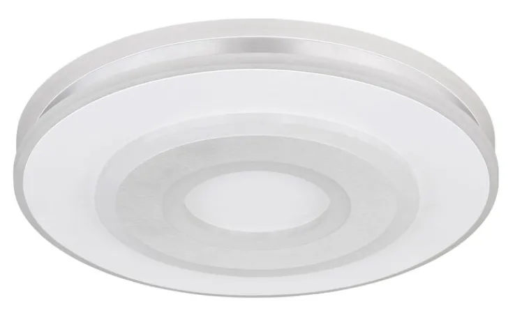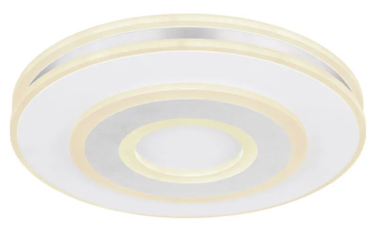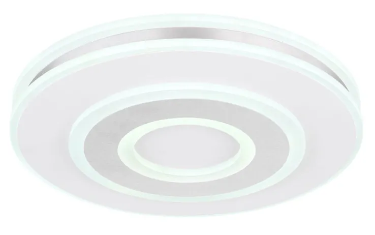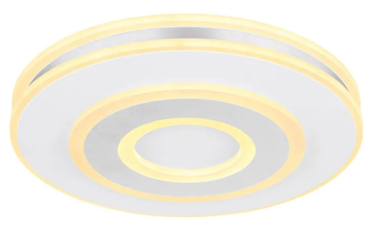 Die LED Deckenlampe MARU von GLOBO zeigt sich in einem modernen Design. Gebürstetes Aluminium und Acryl sind hier vereint. Die Lampe hat einen Durchmesser von 42 cm und verfügt über runde LED Platinen, die sich über eine Fernbedienung steuern lassen.