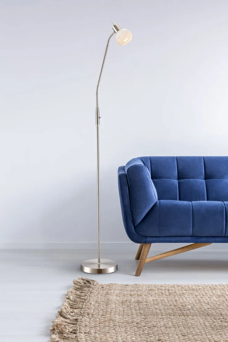 Bodenplatte und Gestell sind bei der Stehlampe ELLIOT von GLOBO aus Metall silberfarbig ausgeführt. Der obere Teil des Lampengestells ist mit einem Ein/Ausschalter versehen und mehrfach verstellbar. Sie können den Tragarm neigen und den kugelförmigen Lampenschirm aus Glas in Weiß drehen. Das LED Leuchtmittel verbraucht 5 Watt und brennt, unabhängigen Tests zufolge etwa 10.000 Stunden. Die Helligkeit beträgt 320 Lumen, die Farbtemperatur 3.000 Kelvin. Wenn Sie sich für ein weniger energieeffizientes Leuchtmittel entscheiden, steigt der maximale Energieverbrauch der Stehleuchte ELLIOTT auf 40 Watt. Das Produkt von GLOBO ist für den inneren Wohnbereich konzipiert, CE zertifiziert und entspricht der Schutzart IP 20 sowie der Schutzklasse 2.
