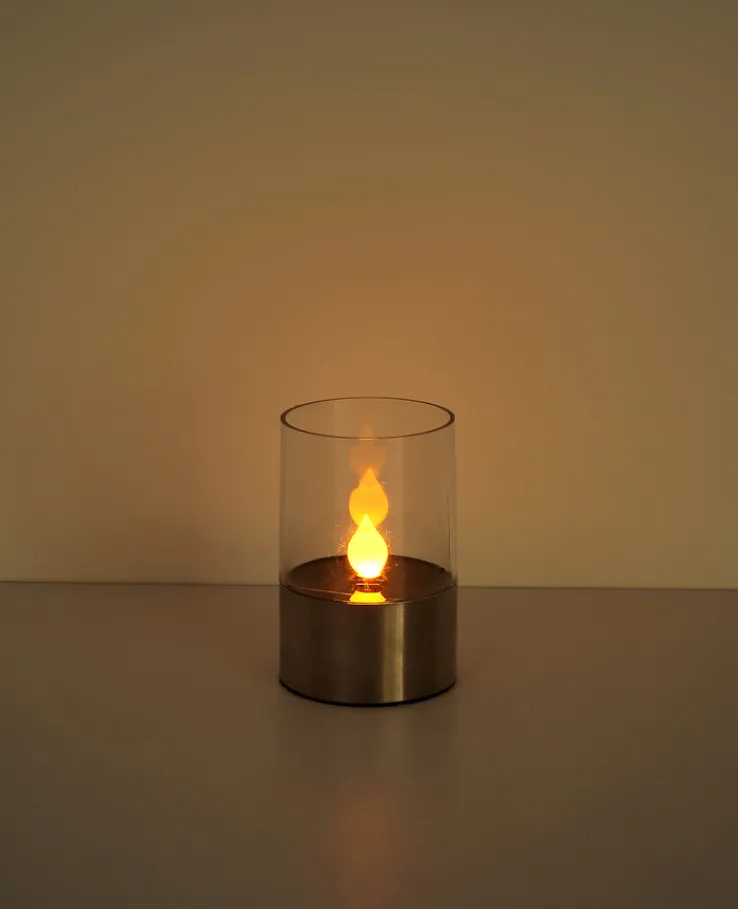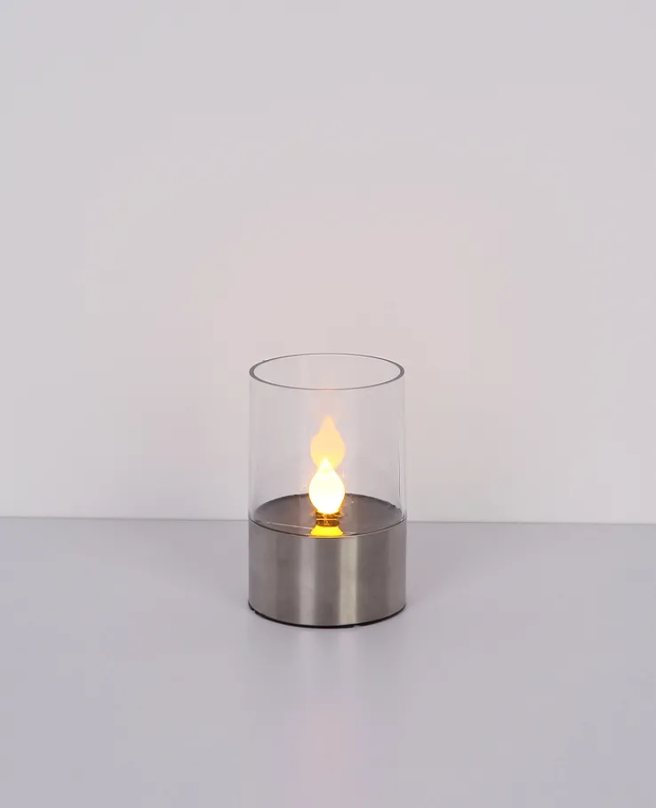 Die moderne GLOBO LED Solarlampe MAD hat eine Höhe von 11 cm und kombiniert einen nickelfarbigen Edelstahl-Korpus mit einem transparenten Kunststoffschirm. Mit der fest eingebauten LED mit Flammeneffekt wirkt die Solarlampe bei Dunkelheit wie ein Teelichthalter. Tagsüber wird der Solar Akku durch das auftreffende Sonnenlicht aufgeladen und abends ist die Gartenlampe wieder einsetzbar. Ein- und Ausschalten lässt sich das batteriebetriebene und spritzwassergeschützte Tischlicht bequem über einen Schiebeschalter. Durch das schlichte Design harmoniert die Solarlampe problemlos mit jedem Einrichtungsstil.